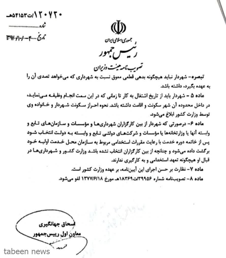 از آن جایی که شهردار طبق قانون باید دارای شرایط لازم برای این سمت باشد و قانون به وضوح در قالب آیین نامه اجرایی شرایط احراز تصدی سمت شهردار(مُصوبه هیات وزیران به تاریخ ۱۳۷۹/۱۰/۰۴) هم شرایط عمومی و هم شرایط اختصاصی را برای شهرداران کلانشهرها بیان نموده و نحوه احراز سکونت شهردار و خانواده ی وی را به ابلاغیه وزارت کشور موکول نموده است و از آن مهمتر طبق ماده ۷ نظارت بر حُسن اجرا این آیین نامه به عهده وزارت کشور گذاشته شده است.