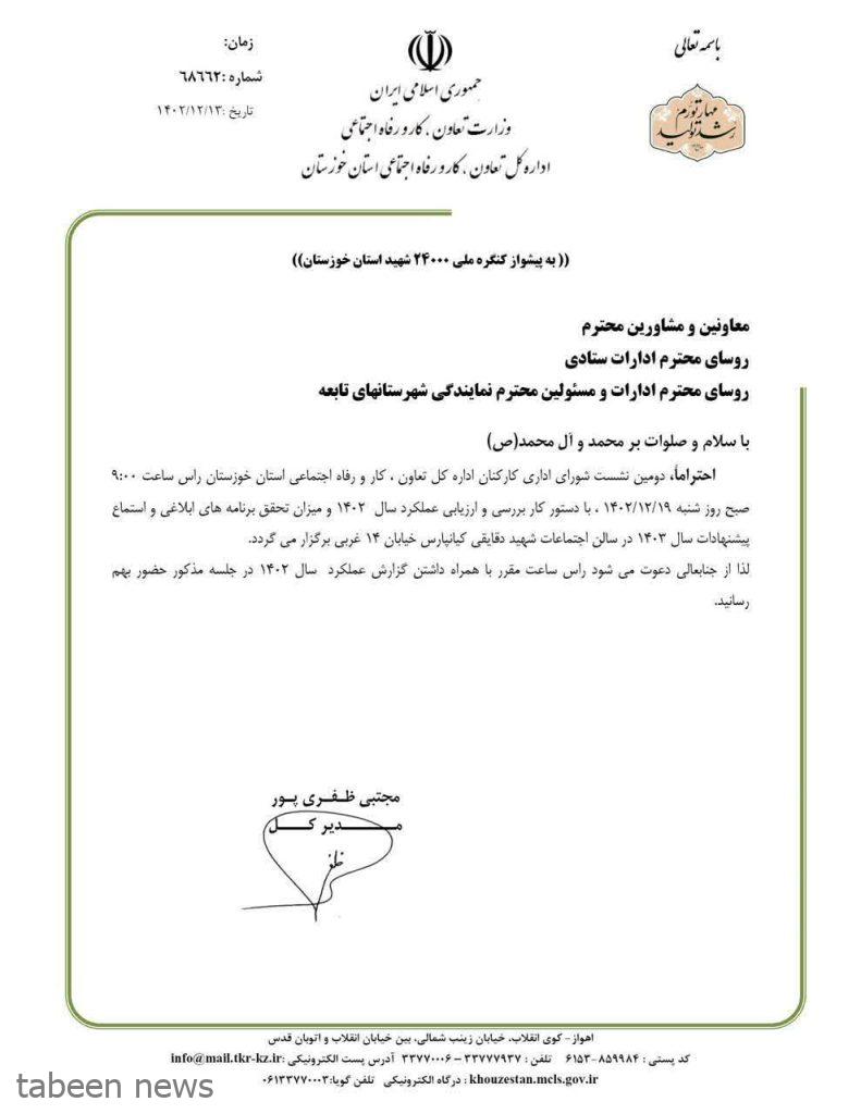 به گزارش تبیین نیوز مجتبی ظفری پور مدیرکل تازه منصوب شده اداره کل تعاون، کار و رفاه اجتماعی استان روز شنبه ۱۹ اسفند ۱۴۰۲ جلسه شورای اداری این دستگاه را از ساعت ۹ صبح الی ۱۷ با حضور کلیه معاونین و مشاورین، رؤسای ستادی و شهرستانی در اهواز برگزار کرد.